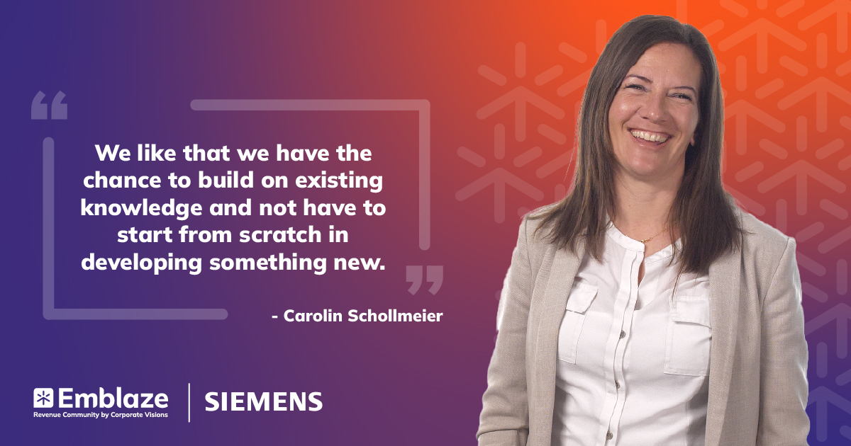 Revenue leaders rarely have time to start strategies from scratch. With her Emblaze membership, Carolin Schollmeier, Lead of Digital Sales Enablement at Siemens, cherry-picks from the Idea Lab to infuse her own approaches, along with insights and ideas gleaned at the annual Emblaze Summit.