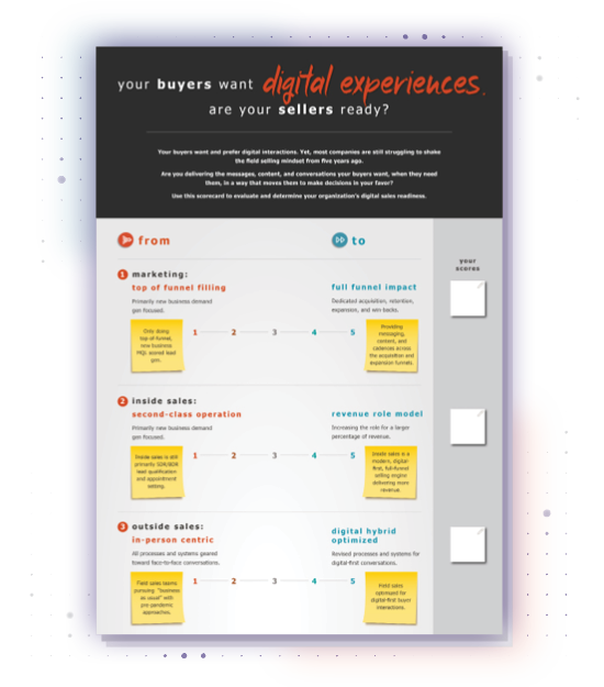 Your buyers want and prefer digital interactions. Yet, most companies are still struggling to shake the field selling mindset from five years ago. Are you delivering the messages, content, and conversations your buyers want, when they need them, in a way that moves them to make decisions in your favor? Use this scorecard to evaluate and determine your organization’s digital sales readiness in six vital areas: