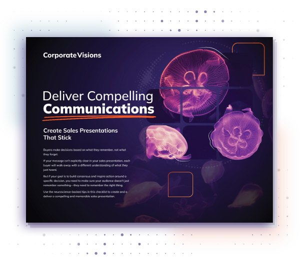 Buyers make decisions based on what they remember, not what they forget. If your message isn’t explicitly clear in your sales presentation, each buyer will walk away with a different understanding of what they just heard. But if your goal is to build consensus and inspire action around a specific decision, you need to make sure your audience doesn’t just remember something—they need to remember the right thing. Use this checklist to create and deliver a compelling and memorable sales presentation. You’ll get neuroscience-backed tips for how to:
