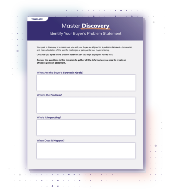 In discovery, your mission is to make sure you and your buyer are on the same page about the specific problem they need to solve. Because only once you truly grasp their issue can you offer up an effective solution. But how do you capture and clearly articulate the problem, so you can get aligned? Use this template to craft a problem statement that captures the core of your buyer’s issue. Then you can include all the essential elements in the problem statement and gain a clear understanding of: