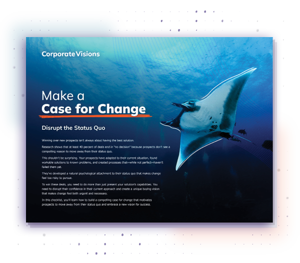 Forty percent of deals stall out not because your solution isn’t strong—but because prospects see no reason to move from what they already know.  They’ve adapted, found workarounds, and convinced themselves that “good enough” is safe.  The real cause of stalled and no-decision deals is your prospect’s attachment to their current way of doing things. To win, you need to shake their confidence in the status quo and give them a new vision for what’s possible.  In this checklist, you’ll see how to: