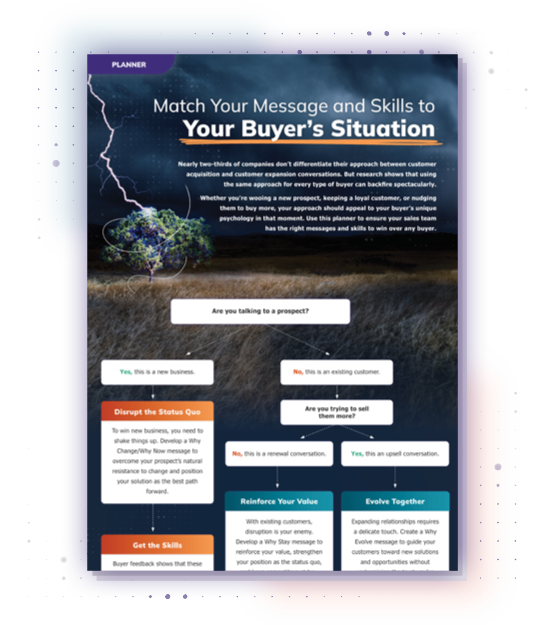 Nearly two-thirds of companies don’t differentiate their approach between customer acquisition and customer expansion conversations. But research shows that using the same approach for every type of buyer can backfire spectacularly. Whether you’re wooing a new prospect, keeping a loyal customer, or nudging them to buy more, your approach should appeal to your buyer’s unique psychology in that moment. Use this planner to ensure your sales team has the right messages and skills to win every commercial moment. You’ll find out: