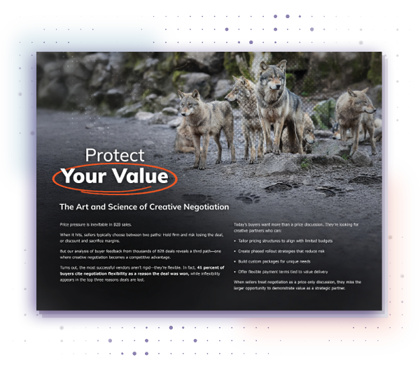 Price pressure is inevitable in B2B sales. When it hits, sellers typically choose between two paths: Hold firm and risk losing the deal, or discount and sacrifice margins. But what if there was a third path—one where creative negotiation becomes a competitive advantage? In this Winsight, you’ll see analysis of buyer feedback from thousands of B2B deals, and why buyers value creative negotiation partners. You’ll discover: